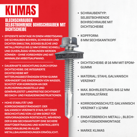 Die selbstbohrenden Bohrschrauben von KLIMAS sind speziell entwickelt für die sichere und dichte Befestigung von Blechen und Metallprofilen bis zu einer Stärke von 12 mm. Dank der integrierten Dichtscheibe mit Gummi (EPDM) wird eine dauerhafte Abdichtung gegen Feuchtigkeit und Witterungseinflüsse gewährleistet – ideal für Dach- und Fassadenmontage.