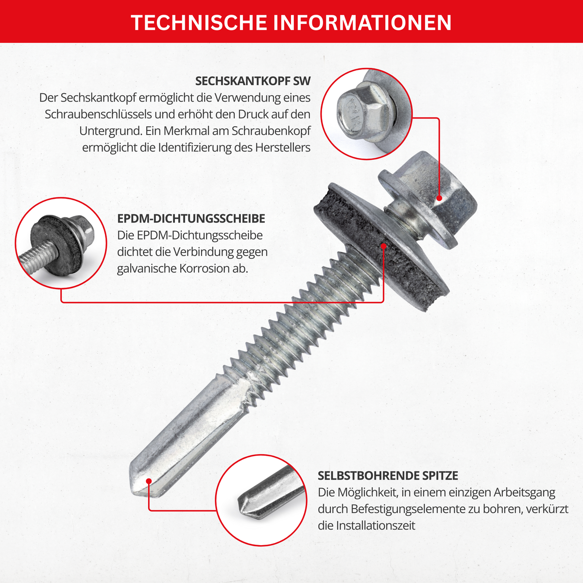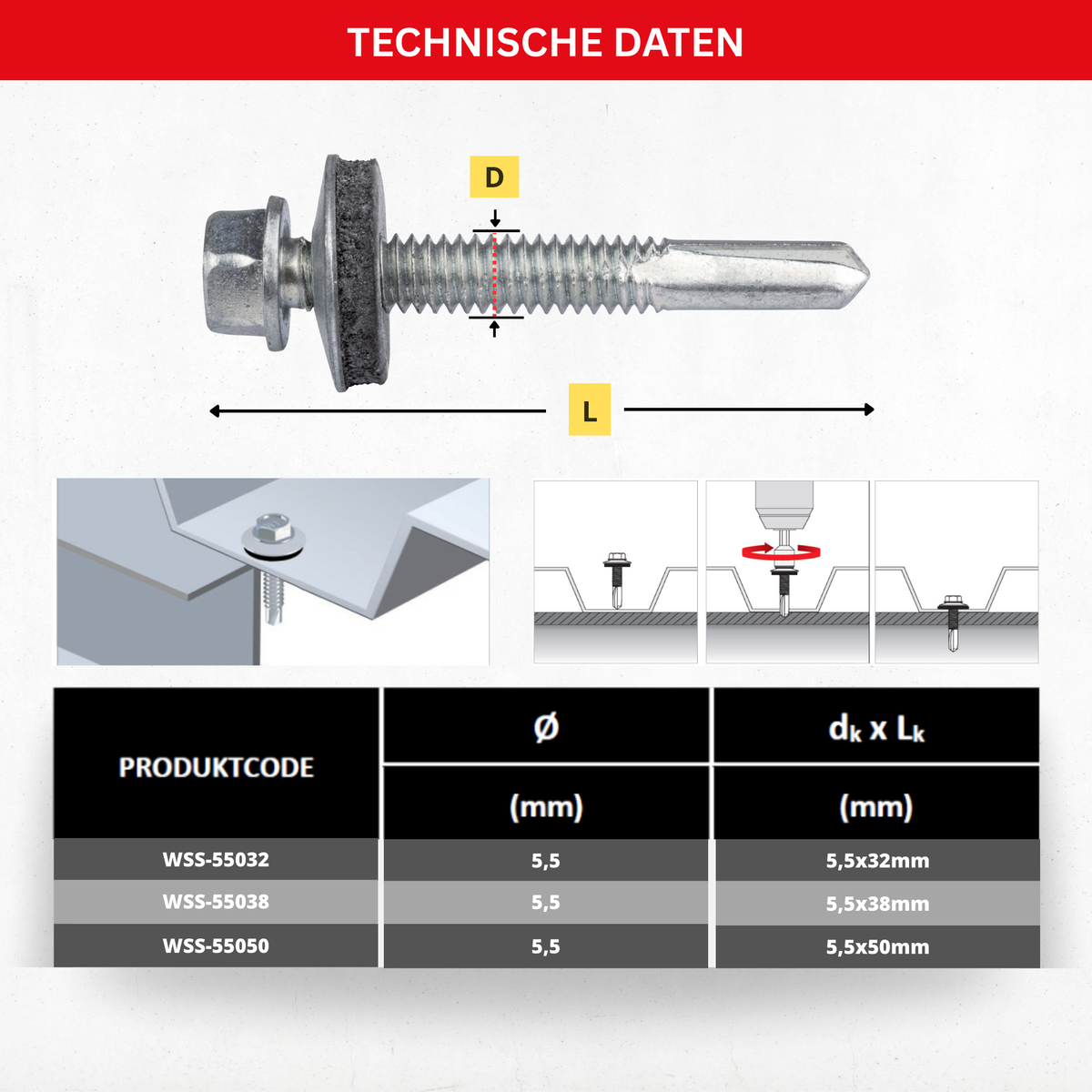 - Schraubentyp: Selbstbohrende Bohrschraube mit Dichtscheibe