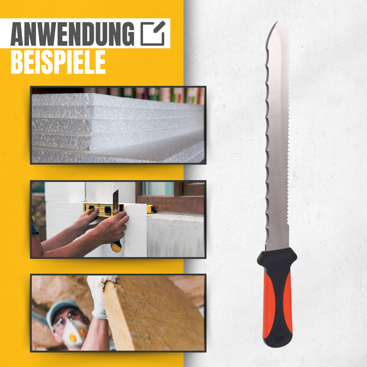 Der ergonomische 2-Komponenten-Softgriff garantiert sicheren Halt und ermüdungsfreies Arbeiten. Die doppelt gezahnte Klinge sorgt für präzise Ergebnisse: der Sägeschliff schneidet harte Dämmstoffe, während der Wellenschliff ideal für weiche Materialien ist. Die Klingenspitze kann zudem zum Bohren in Dämmstoffen verwendet werden. Das mitgelieferte Holster ermöglicht eine sichere und komfortable Aufbewahrung des Messers während der Arbeit.