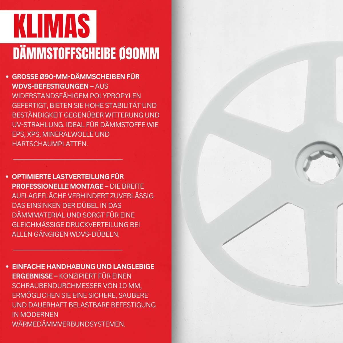 Die KLIMAS Dämmstoffscheiben sind speziell entwickelt für die sichere und dauerhafte Befestigung von Wärmedämmverbundsystemen (WDVS). Sie gewährleisten eine optimale Druckverteilung des Dübels auf der Dämmoberfläche und verhindern effektiv das Einsinken des Dübeltellers in das Dämmmaterial.