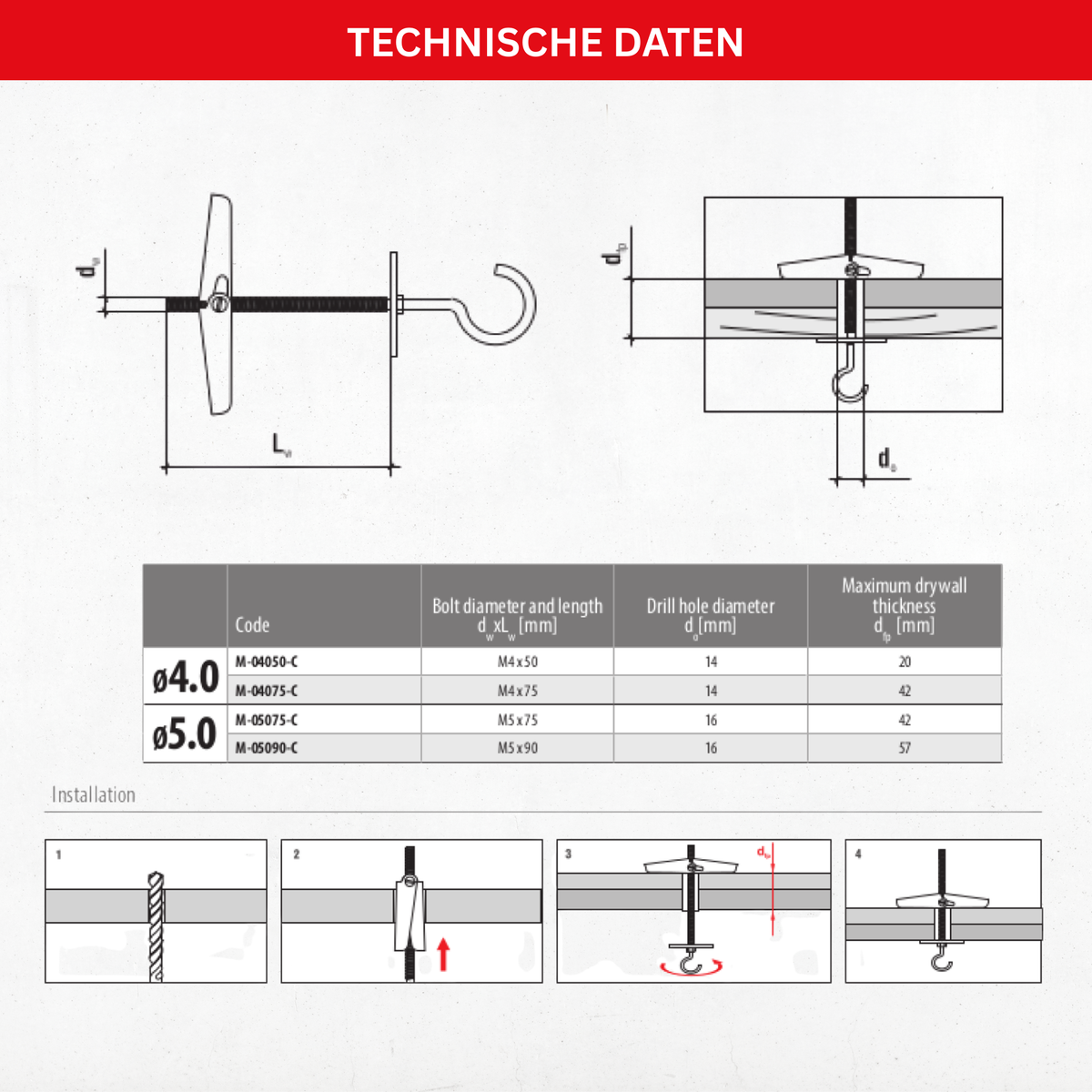 Federklappdübel 4x75 mm / 50 Stk. - Kippdübel mit Deckenhaken „C”