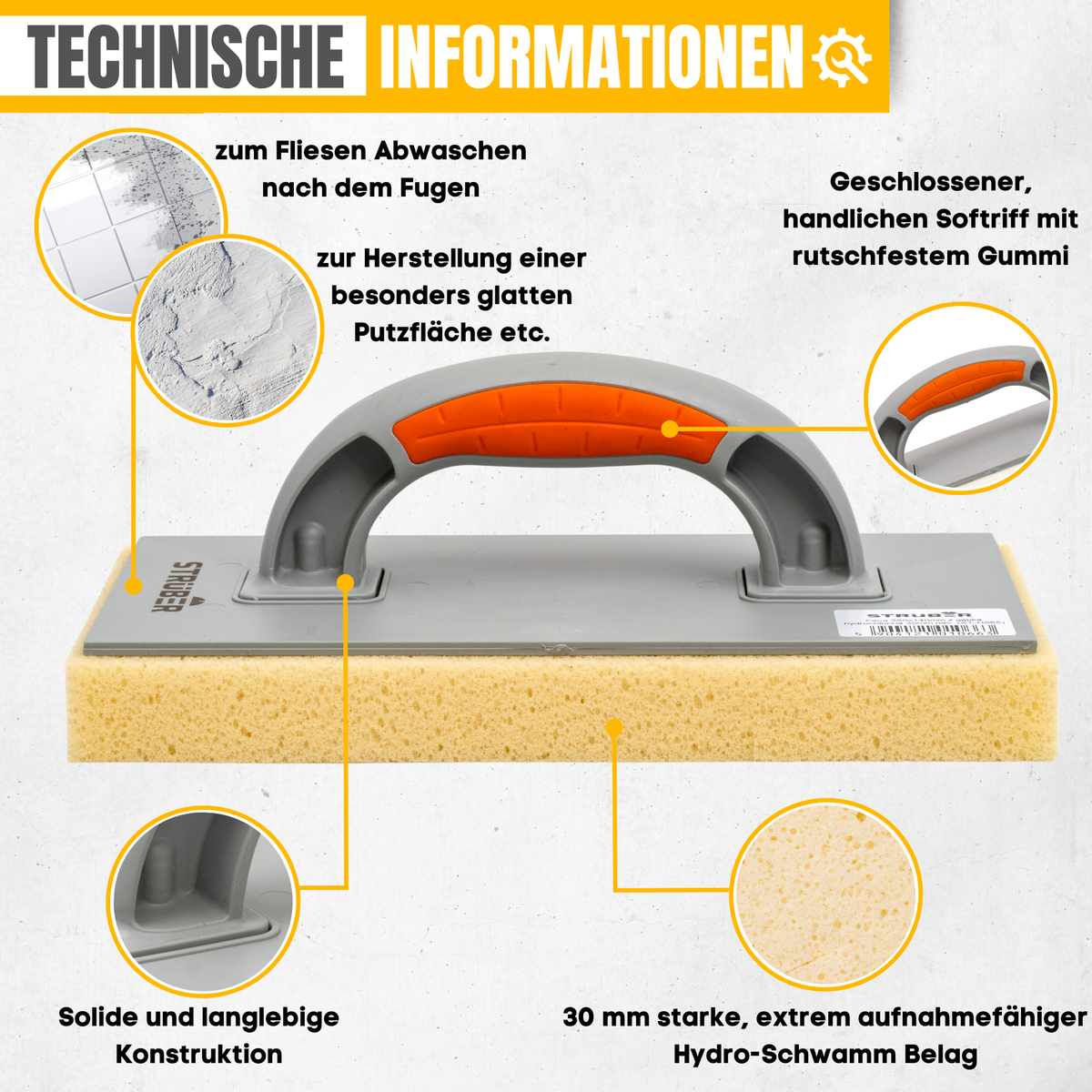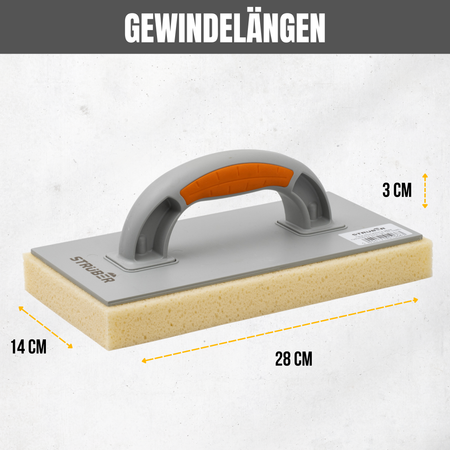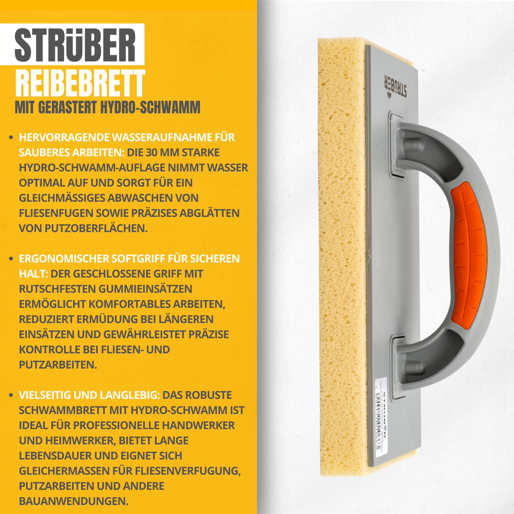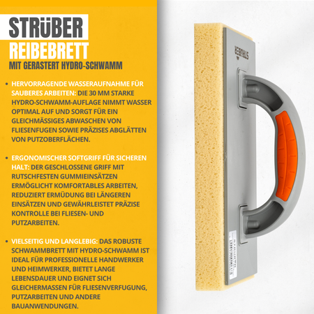 Das Schwammbrett von STRÜBER verfügt über eine spezielle Hydro-Schwamm-Auflage, die sich ideal zum Abglätten und Abwaschen beim Verfugen von Fliesen sowie bei anderen Maurer- und Putzarbeiten eignet. Der geschlossene, handliche Softgriff mit rutschfesten Gummieinsätzen sorgt für einen sicheren Halt und komfortables Arbeiten.