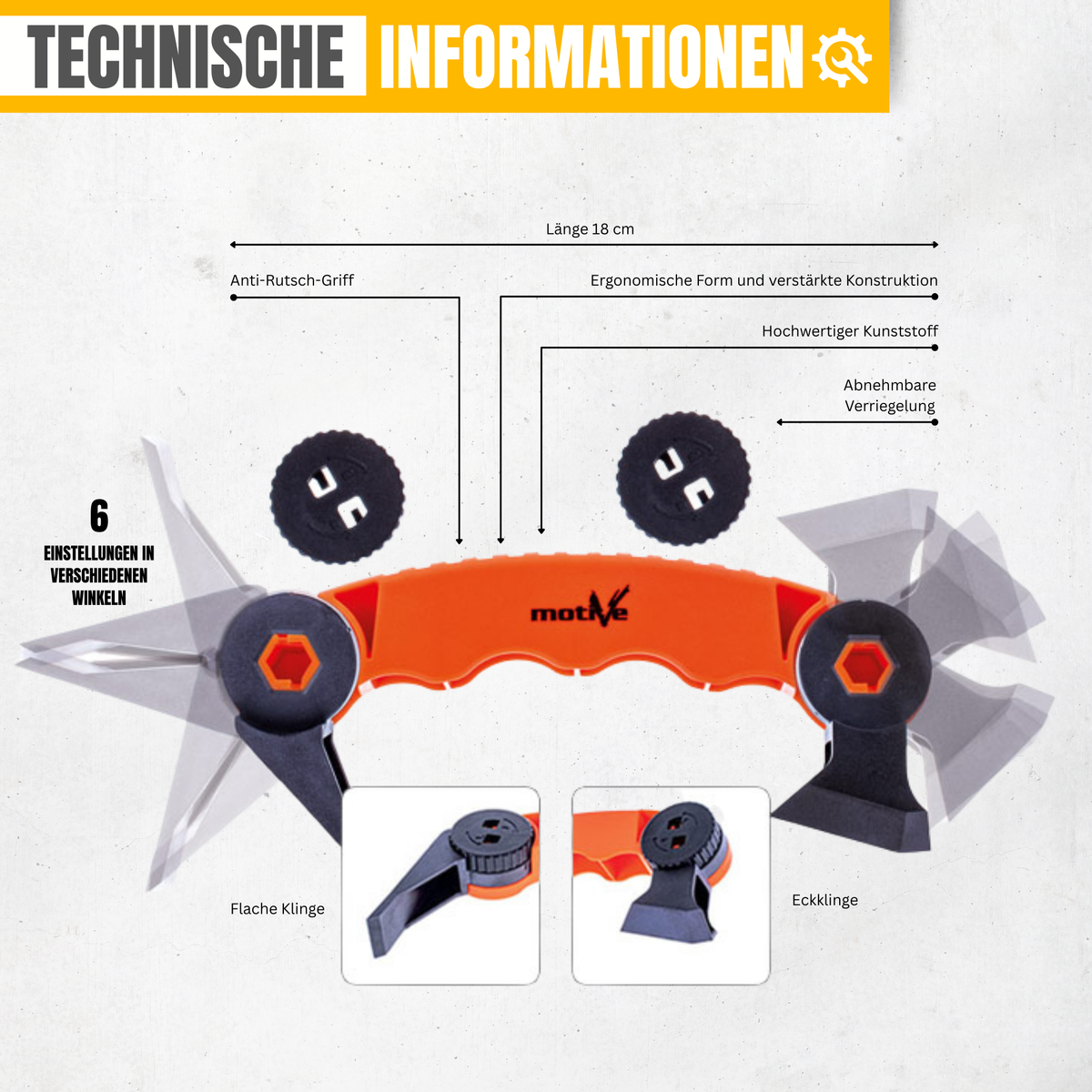 Das Fugenmesser besteht aus hochwertigem Kunststoff und besitzt einen Anti-Rutsch-Griff für sicheren Halt. Die ergonomische Form und verstärkte Konstruktion sorgen für eine komfortable Handhabung, während die abnehmbare Verriegelung und die sechs Winkeleinstellungen flexible Anwendungen ermöglichen.