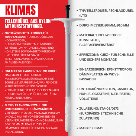 Der Dämmstoffdübel LTX von KLIMAS ist ein zuverlässiger Schlagdübel zur Befestigung von außenliegenden Wärmedämmverbund-Systemen (WDVS) mit Putzschicht auf Mauerwerk oder Beton. Der Dübel besteht aus hochwertigem Kunststoff und ist ideal geeignet für Beton, Naturstein, Vollsteine, Hohlblocksteine und Gasbeton.