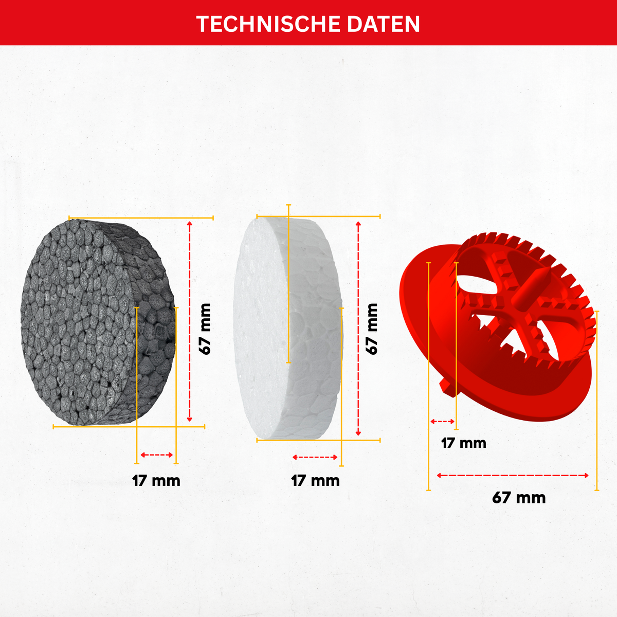 Zum Verschließen von ausgefrästen Löchern und Abdecken der versenkten Dämmstoffhalter. Verhindert Wärmebrücken und erleichtert den Abschluss bei Putzarbeiten.