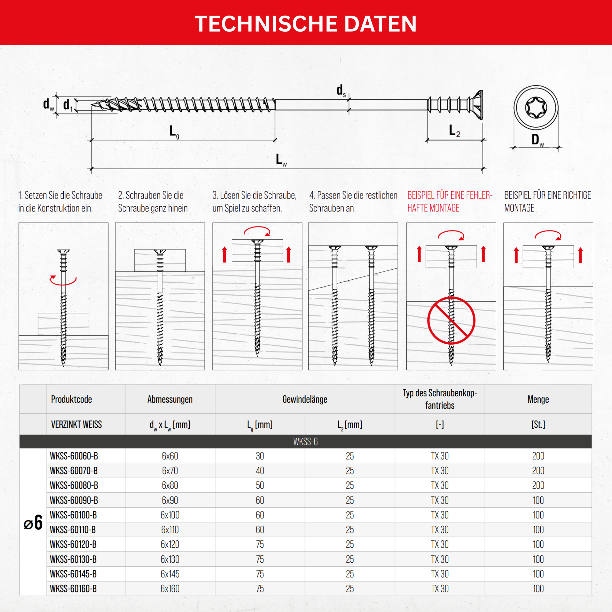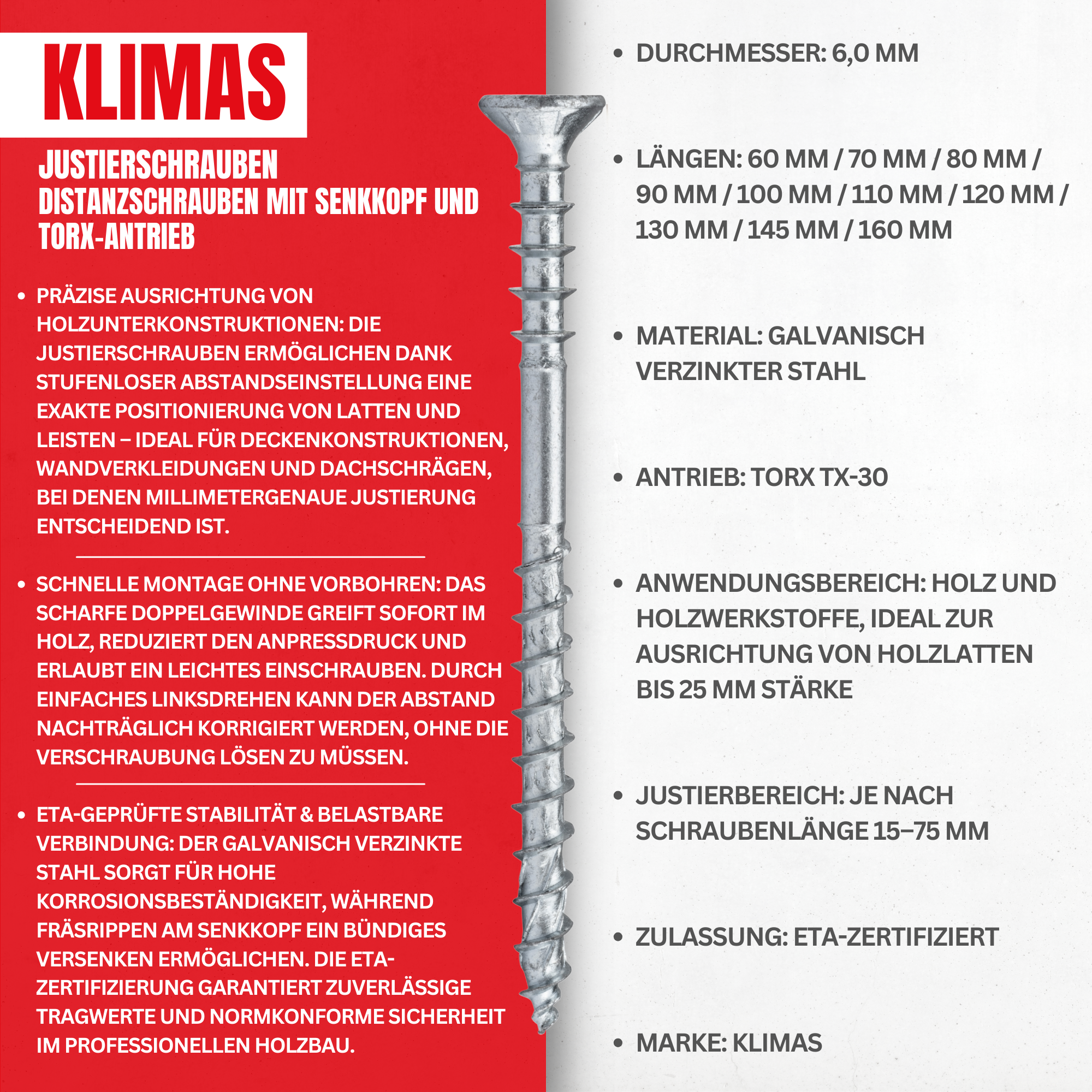 KLIMAS Justierschrauben 6x60 mm / 200 Stk. - Distanzschrauben mit Senkkopf und Torx-Antrieb