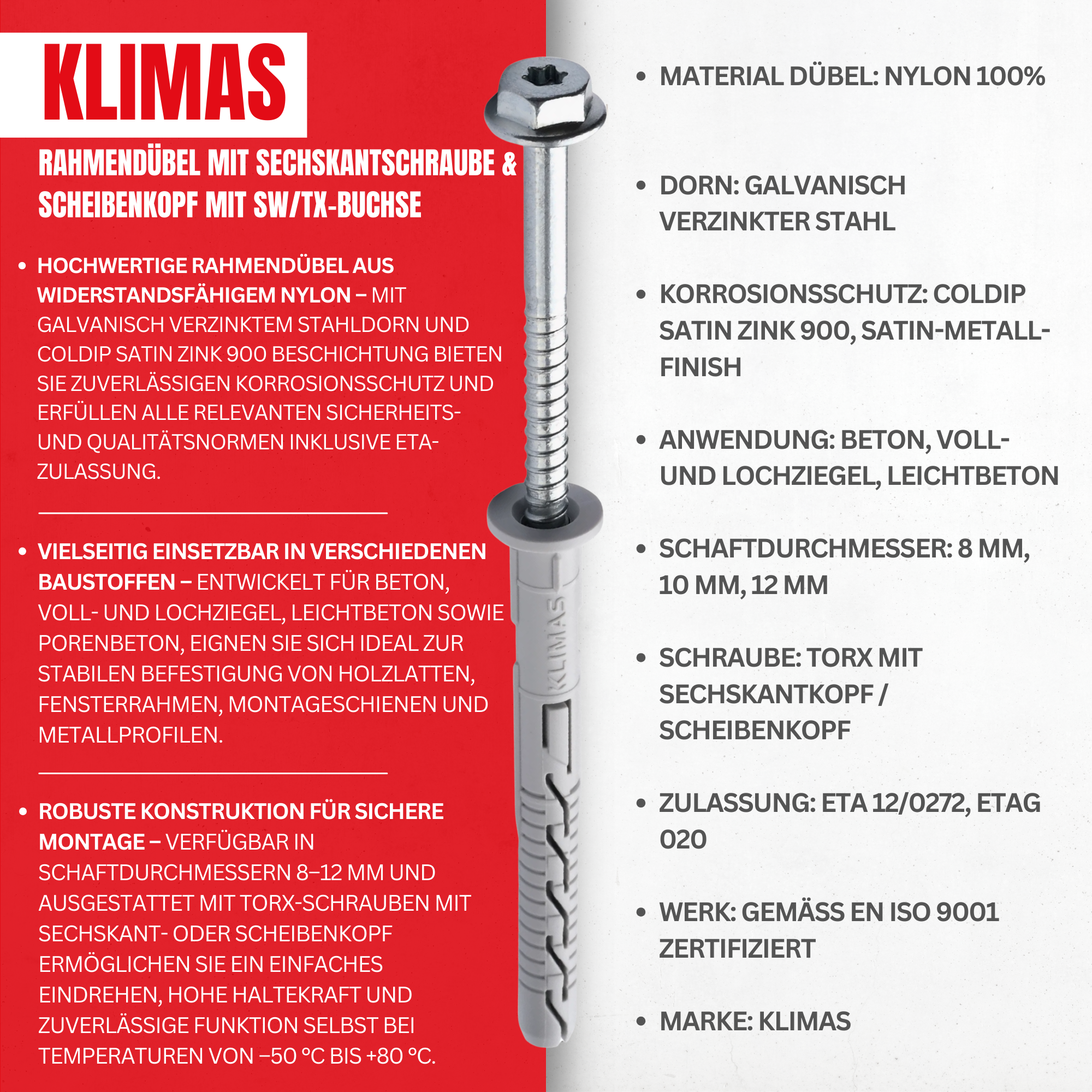 KLIMAS Rahmendübel 12x140 mm / 25 Stk. - Fensterrahmendübel mit Sechskantschraube & Scheibenkopf mit SW/TX-Buchse – Langschaftdübel
