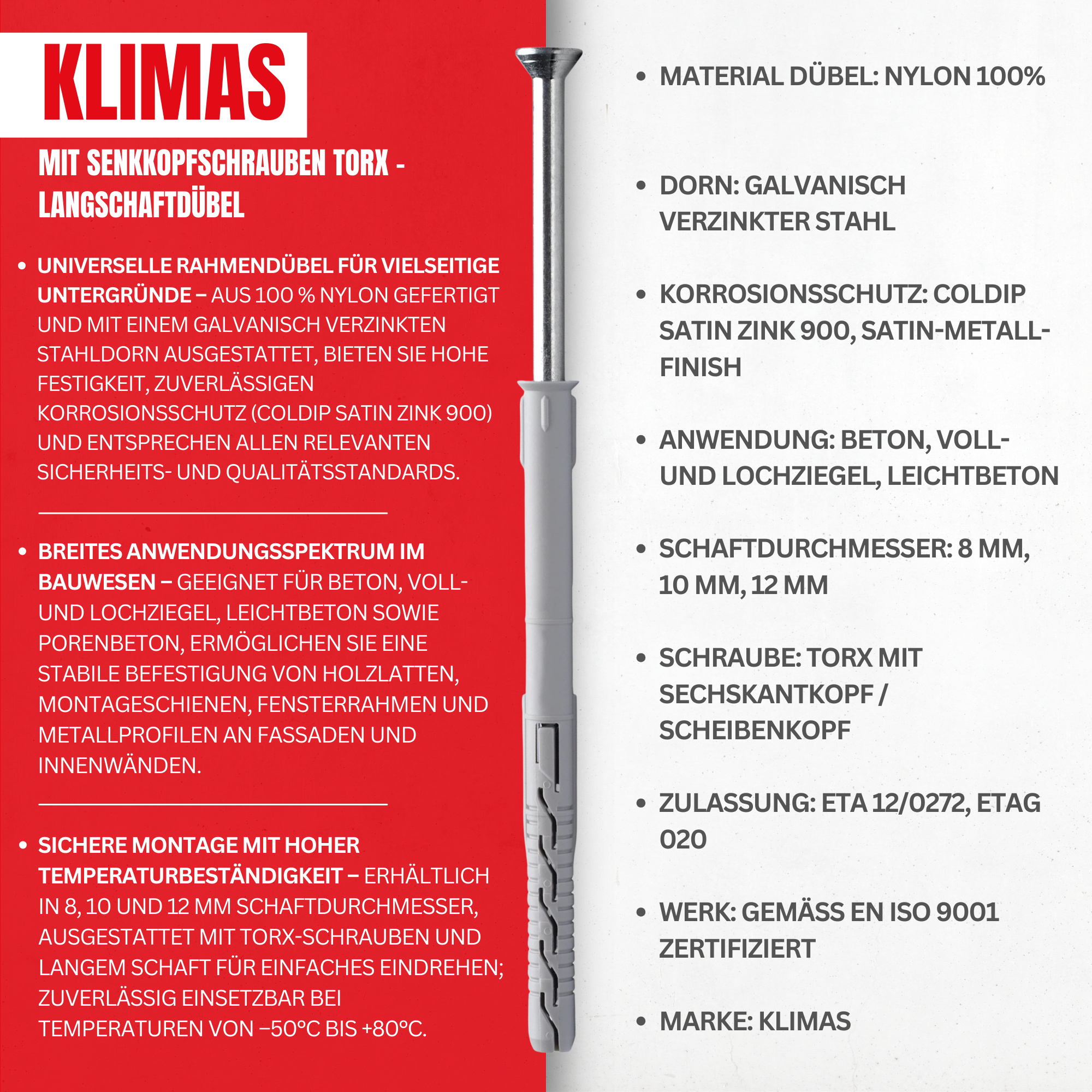 KLIMAS Rahmendübel 8x120 mm / 50 Stk. - Fensterrahmendübel mit Senkkopfschrauben Torx - Langschaftdübel