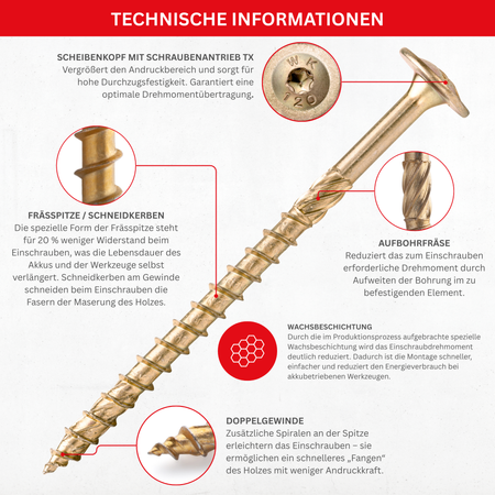 Die Schrauben sind mit einem extra breiten Tellerkopf ausgestattet, der eine besonders hohe Klemmkraft und Zugfestigkeit bietet. Der Torx-Antrieb (TX) sorgt für eine optimale Kraftübertragung bei minimalem Einschraubdrehmoment. Durch die Spezialspitze mit Schneidkerben und den integrierten Schaftfräser wird das Einschrauben erleichtert, ohne das Holz zu spalten oder vorzubohren.