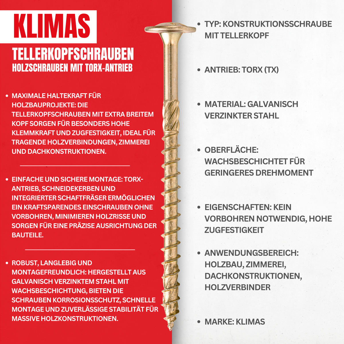 Die Tellerkopfschrauben mit Torx-Antrieb von KLIMAS sind für tragende Holzverbindungen in massiven, verleimten oder Holzwerkstoff-Konstruktionen entwickelt. Diese Konstruktionsschrauben ersetzen herkömmliche Nägel vollständig und ermöglichen eine schnelle, sichere und stabile Montage ohne Vorbohren. Ideal für den professionellen Holzbau, Zimmerei und Dachkonstruktionen.