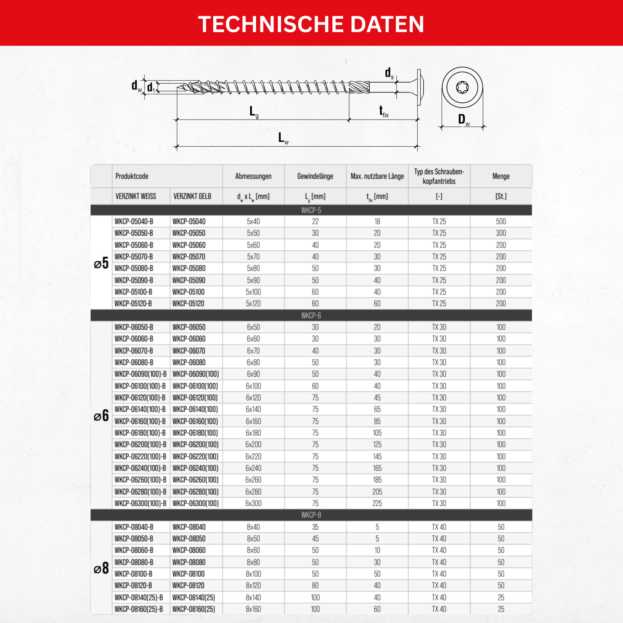 Die Schrauben sind mit einem extra breiten Tellerkopf ausgestattet, der eine besonders hohe Klemmkraft und Zugfestigkeit bietet. Der Torx-Antrieb (TX) sorgt für eine optimale Kraftübertragung bei minimalem Einschraubdrehmoment. Durch die Spezialspitze mit Schneidkerben und den integrierten Schaftfräser wird das Einschrauben erleichtert, ohne das Holz zu spalten oder vorzubohren.