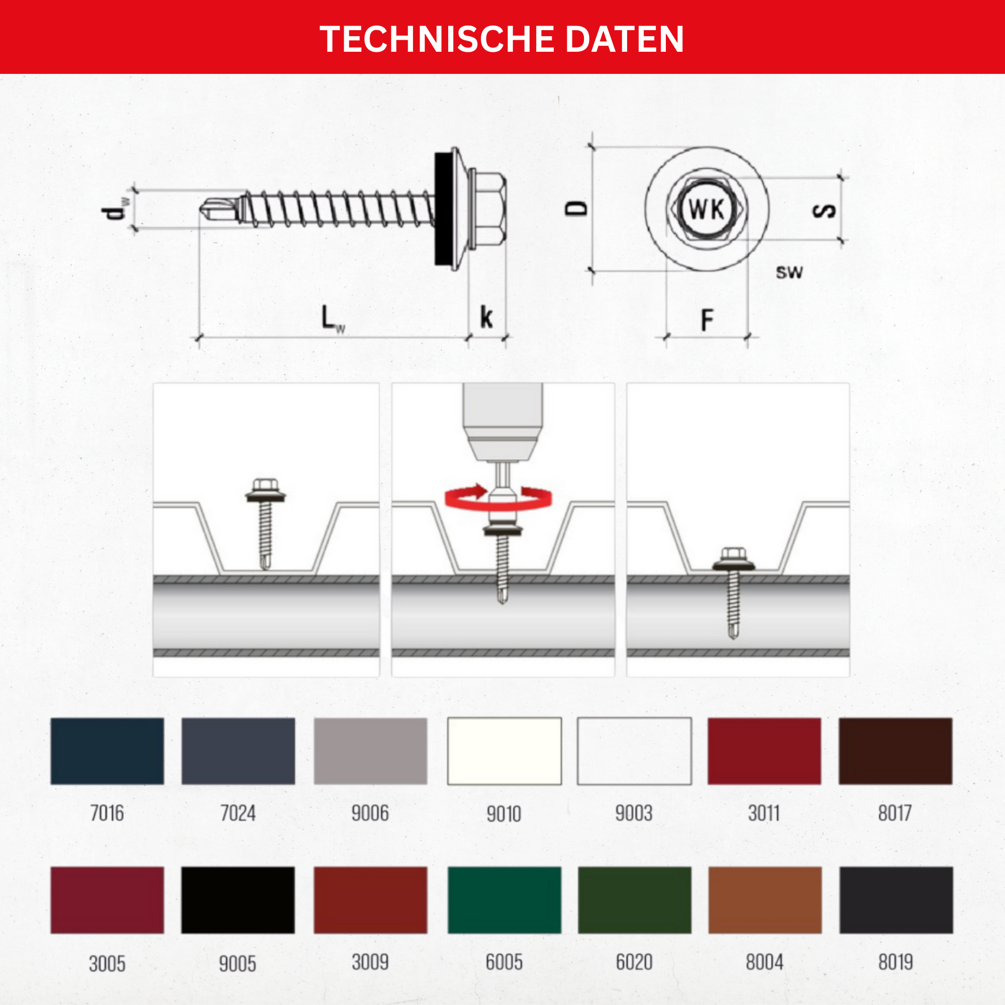 Die Schrauben bieten eine Bohrleistung bis zu 2,5 mm, wodurch das Durchbohren von Stahlblech äußerst schnell und präzise ausgeführt werden kann. Perfekt für Dächer, Fassaden und diverse Montagearbeiten im Holz- und Metallbau.