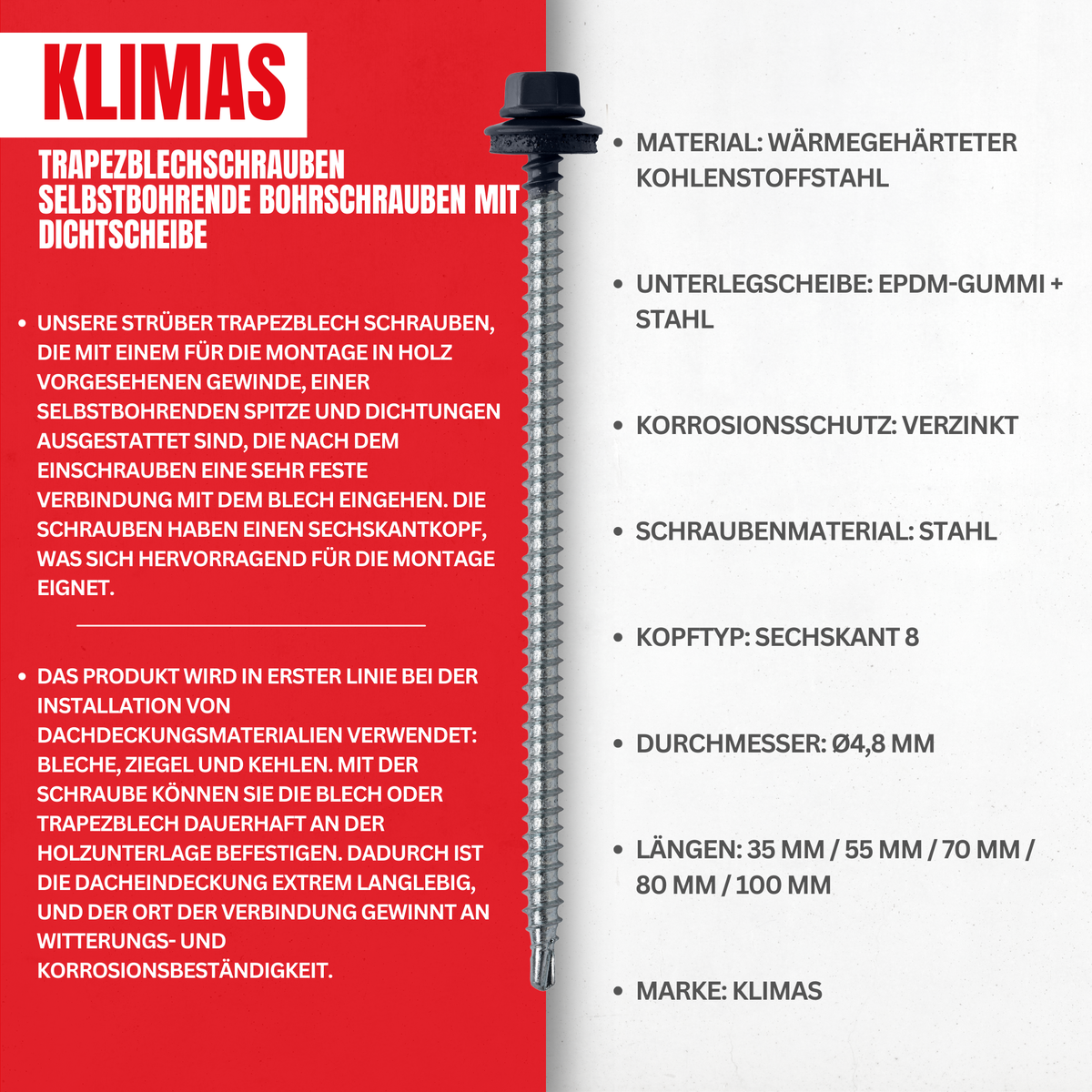 KLIMAS Trapezblechschrauben 4,8x70 mm / 100 Stk. / RAL 9010 - Reinweiß - Selbstbohrende Bohrschrauben mit Dichtscheibe
