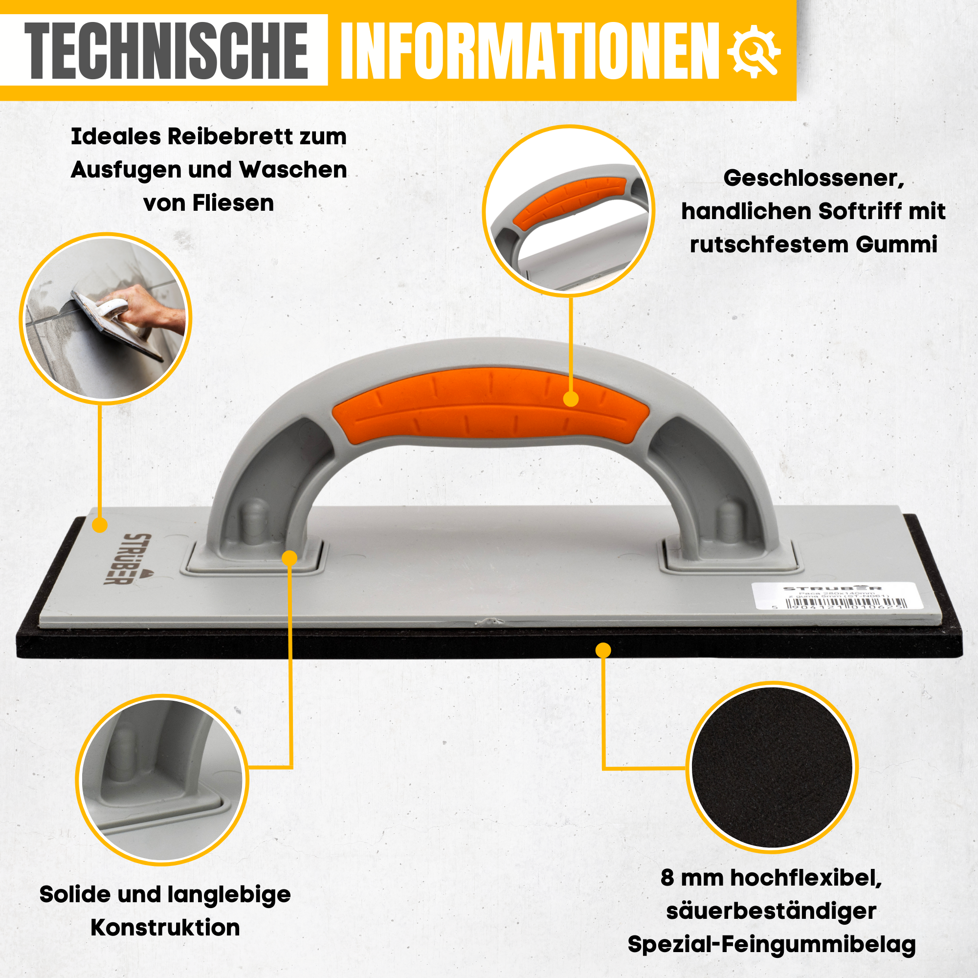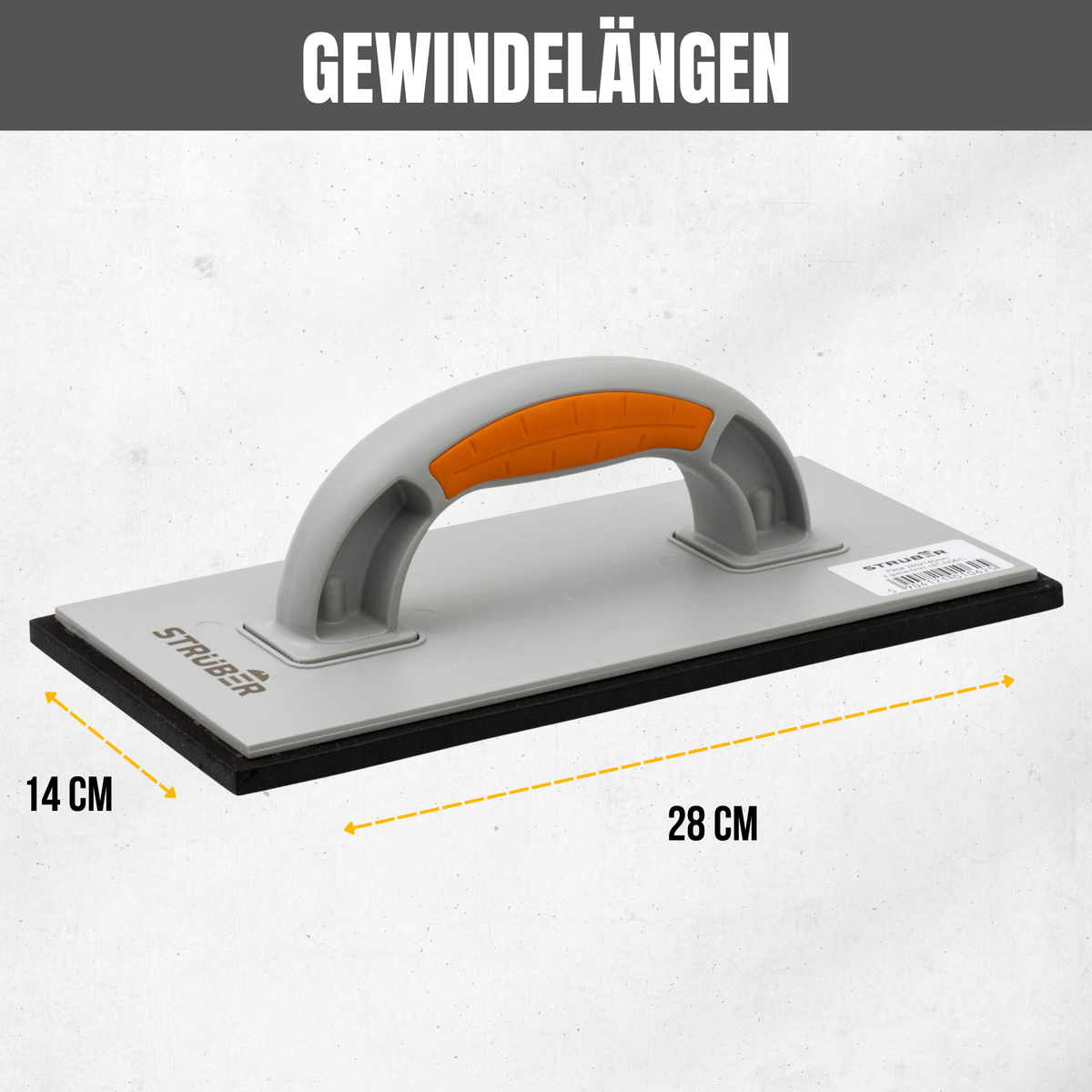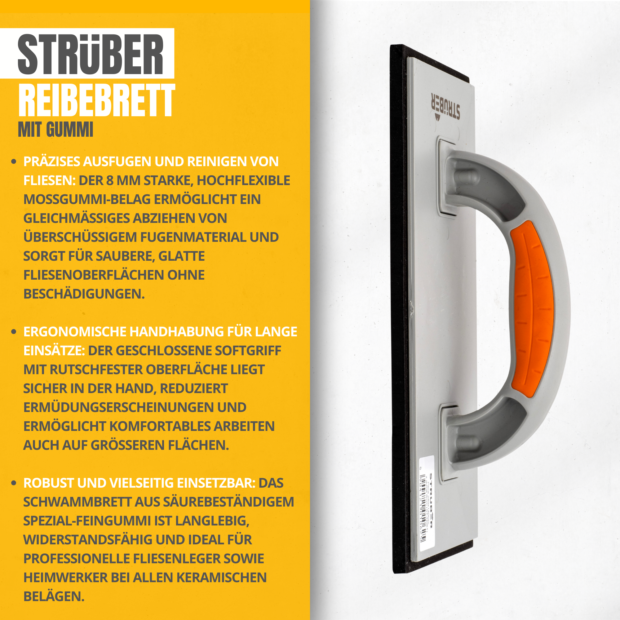 Das Schwammbrett von STRÜBER ist speziell für das Ausfugen und Reinigen von Fliesen und keramischen Belagbaustoffen konzipiert. Der hochflexible Mossgummi-Belag sorgt für eine effektive und gleichmäßige Verarbeitung, während der geschlossene Softgriff mit rutschfester Oberfläche ein komfortables Arbeiten ermöglicht.