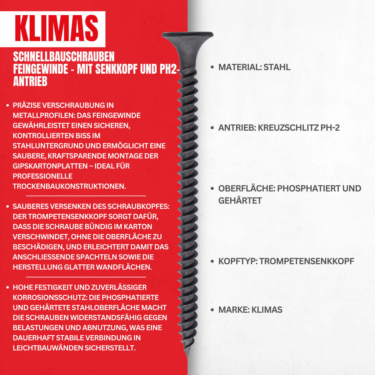 Die Schnellbauschrauben von KLIMAS sind speziell für die Befestigung von Gipskartonplatten auf Stahlunterkonstruktionen entwickelt. Durch ihr Feingewinde lassen sich die Schrauben leicht eindrehen und sorgen für eine stabile, sichere Verbindung zwischen Platte und Untergrund.