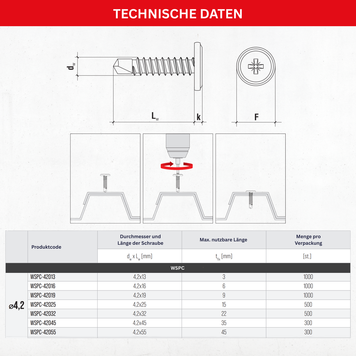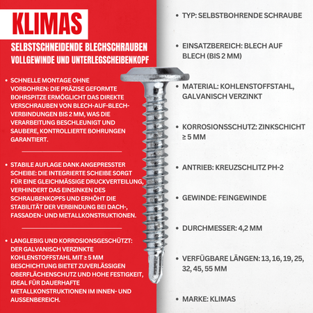 Die KLIMAS WSPC Schrauben sind robuste selbstbohrende Befestigungselemente zur schnellen und sicheren Montage von Blech auf Blech bis zu einer Materialstärke von 2 mm. Dank der präzisen Bohrspitze sind keine Vorbohrungen nötig, was die Montage erheblich beschleunigt. Ideal für Dach-, Fassaden- und Metallkonstruktionen.