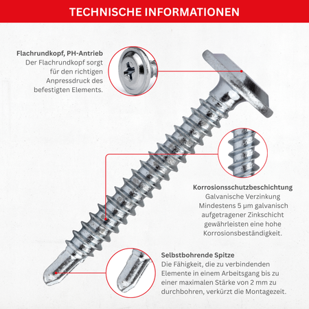 Die Schrauben bestehen aus galvanisch verzinktem Kohlenstoffstahl und bieten ausgezeichneten Korrosionsschutz. Die angepresste Scheibe sorgt für eine sichere und stabile Auflagefläche, während der Kreuzschlitz PH-2 eine komfortable Verschraubung ermöglicht.