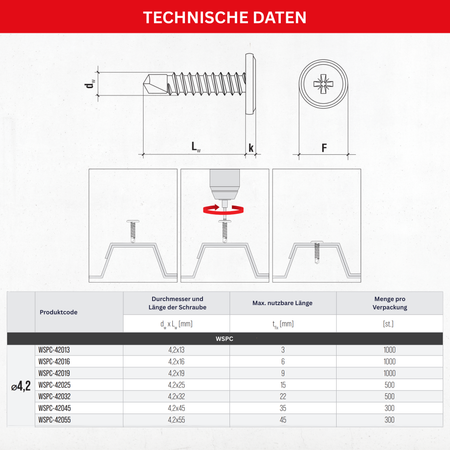 Selbstschneidende Blechschrauben 4,2x45 mm / 300 Stk. - Vollgewinde und Unterlegscheibenkopf