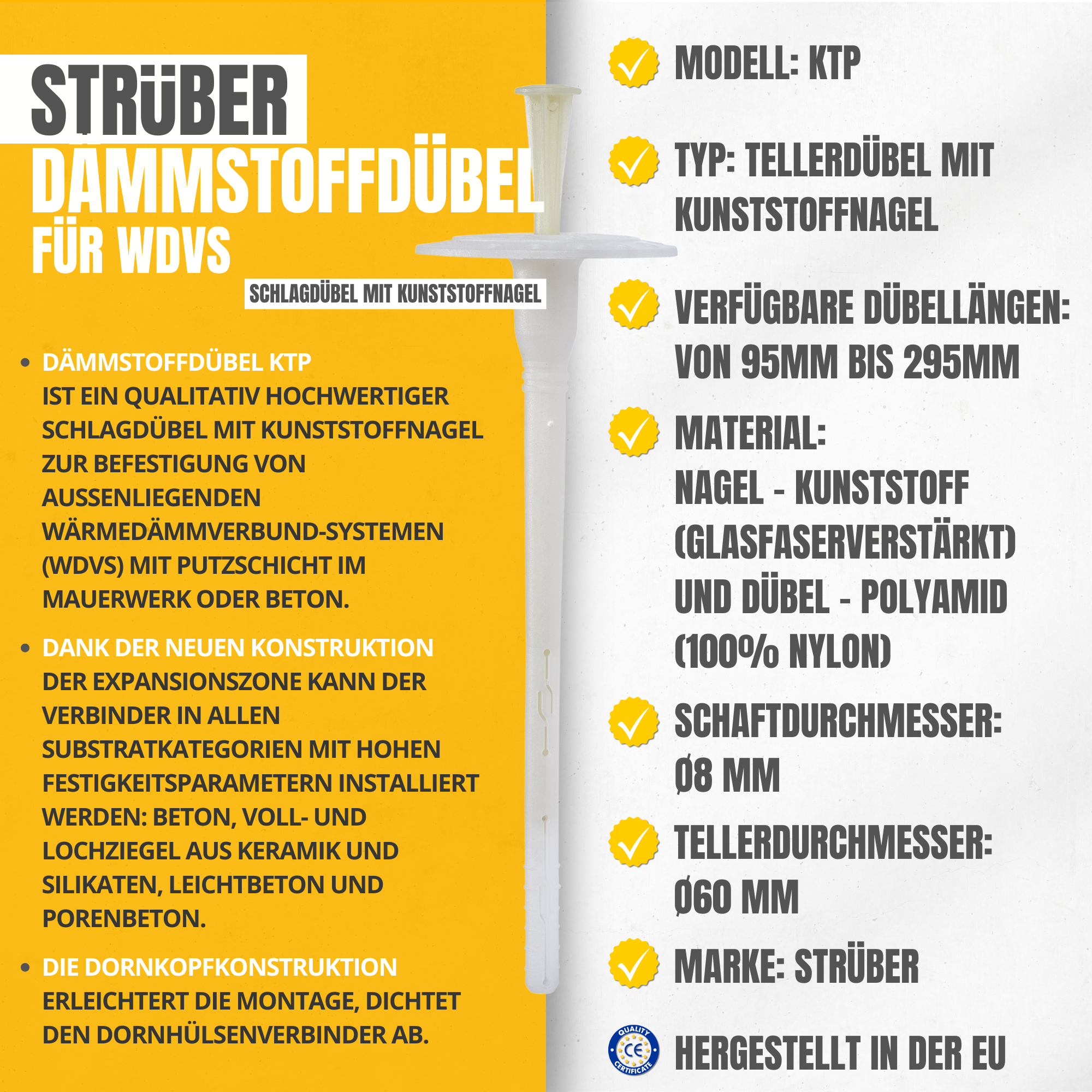 Suchbegriffe: WDVS Dämmstoffdübel, Schlagdübel WDVS, Dämmstoffdübel Kunststoffnagel, Tellerdübel Ø8, WDVS Befestigung, STRÜBER Dübel.