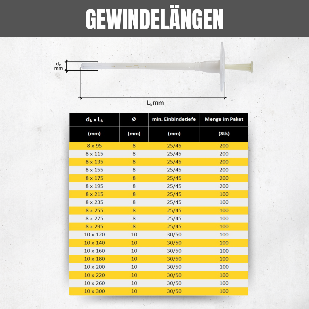 - Verfügbare Dübellängen: 95 mm – 295 mm