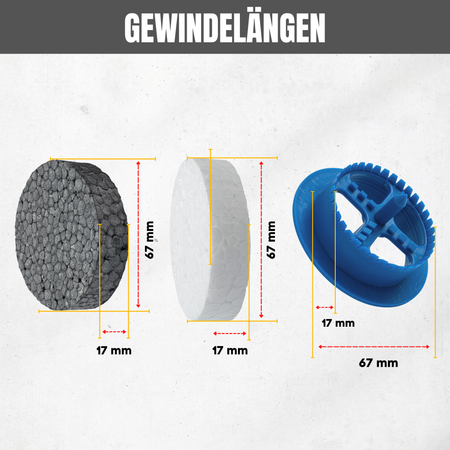 Die Styropor Rondellen dienen zum Verschließen der ausgefrästen Löcher und zum Abdecken der versenkten Dämmstoffhalter. Sie verhindern die Bildung von Kältebrücken und erleichtern den sauberen Abschluss bei Putzarbeiten. Durch ihre ca. 20 mm Dicke können Sie 2 cm kürzere Dübel verwenden – das spart Material und Kosten.