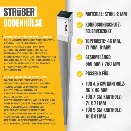 STRÜBER Einschlagbodenhülse 46 x 46 mm / Länge 550 mm - Feuerverzinkt Pfostenträger - Einschlaghülse für Vierkantholzpfosten - Stahl Bodenhülse