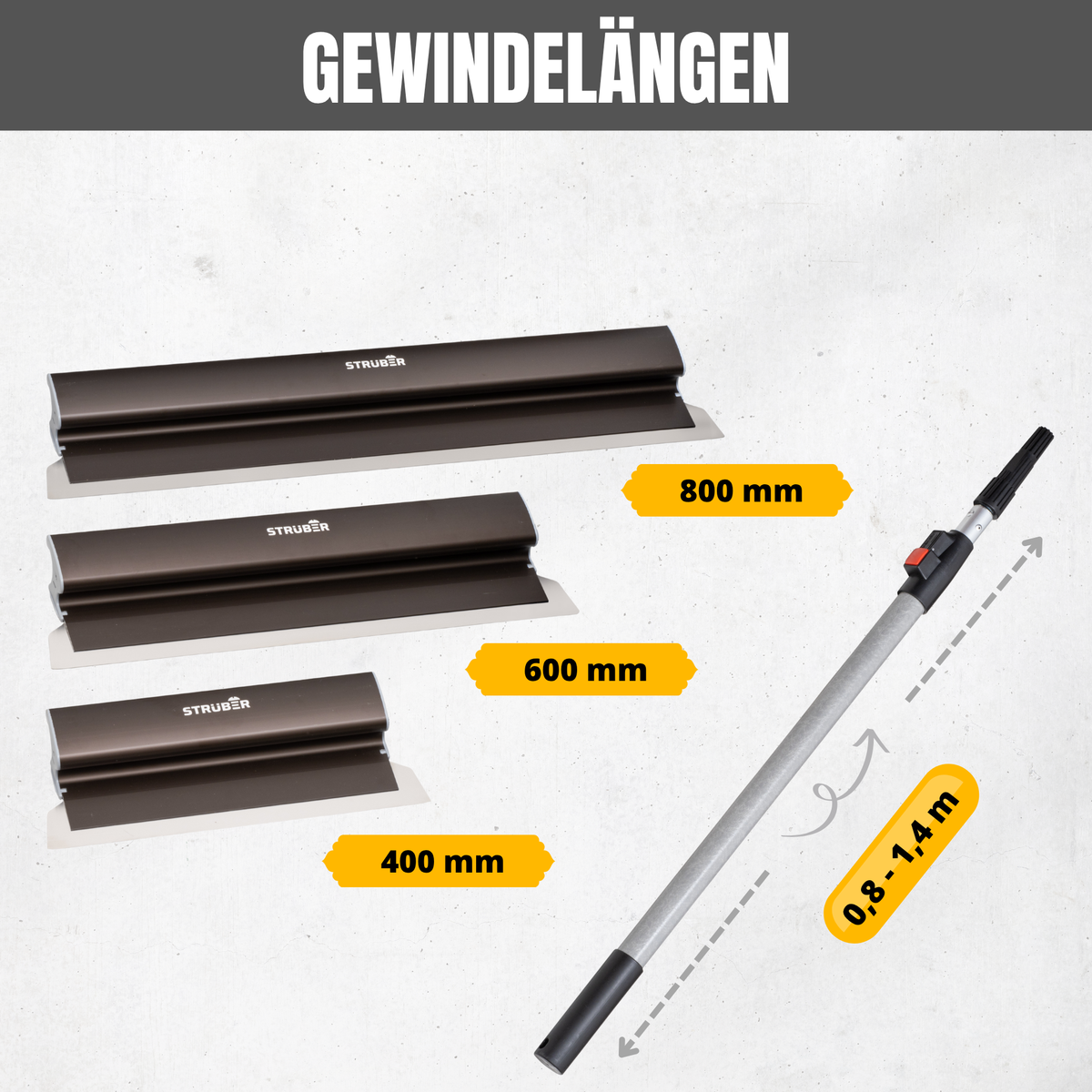 STRÜBER Flächenspachtel Set - 3 x Spachtel mit Aluminium Z-Griff (400mm, 600mm, 800mm) + Teleskopstange + Adapter + Rollspachtel + Werkzeugkoffer / 7-tlg. SET