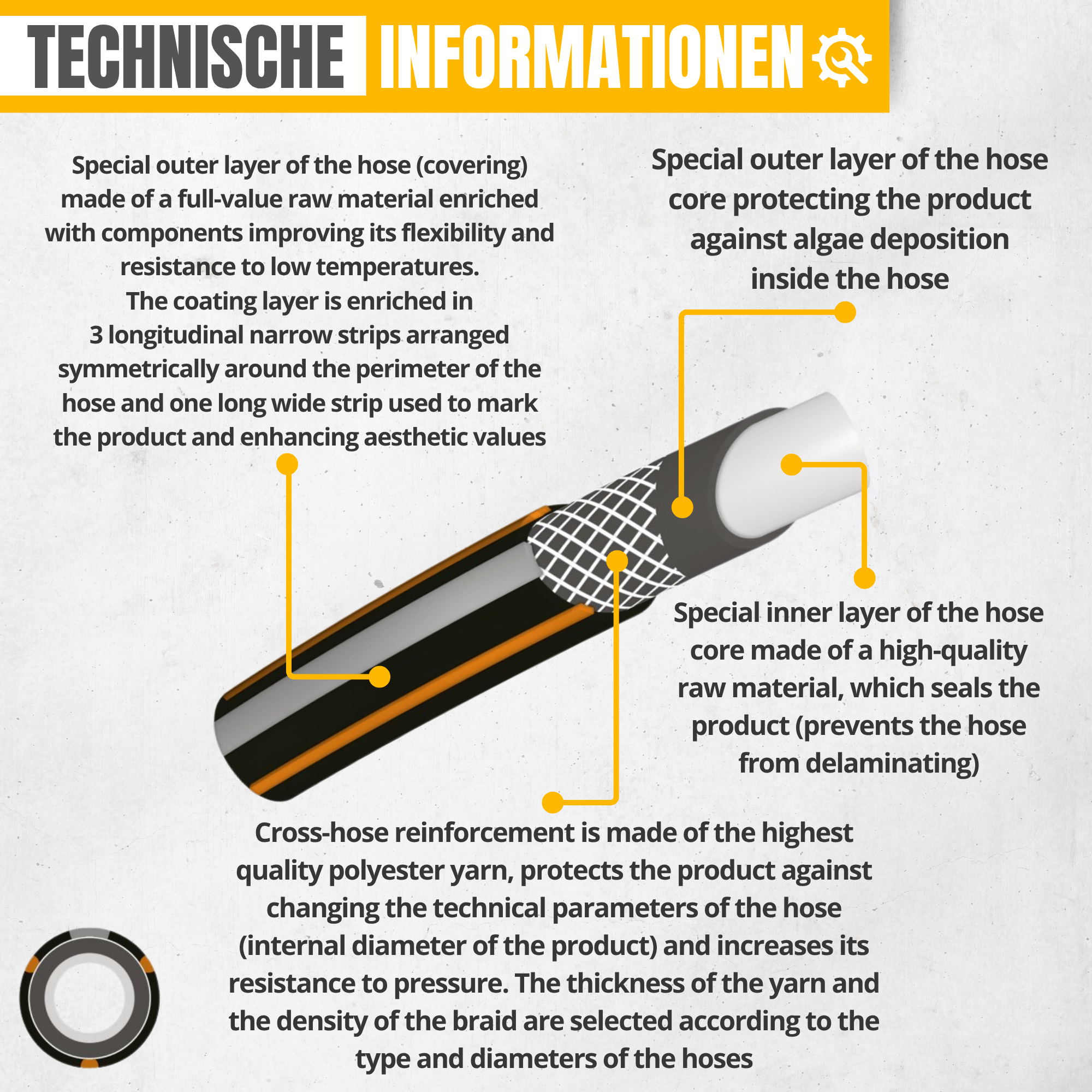 Der 4-lagige CARBON-Gartenschlauch aus hochwertigem PVC ist ideal für Hausgärten, Gartenbau, Pflanzenzucht und landwirtschaftliche Anwendungen. Hergestellt aus Granulat höchster Qualität (Suspensions-Polyvinylchlorid, Terephthalat und weitere Komponenten) und mit zusätzlichem Textilgewebe verstärkt, bietet der Schlauch hohe Flexibilität bei niedrigen Temperaturen. Er transportiert Wasser zuverlässig bei einem Betriebsdruck von 10 bar (20°C) und hält einem Berstdruck von über 30 bar stand. Der Temperaturbereich liegt zwischen -25°C und +60°C. Zudem ist der Schlauch UV- und algenbeständig und für den Kontakt mit Trinkwasser geeignet.
