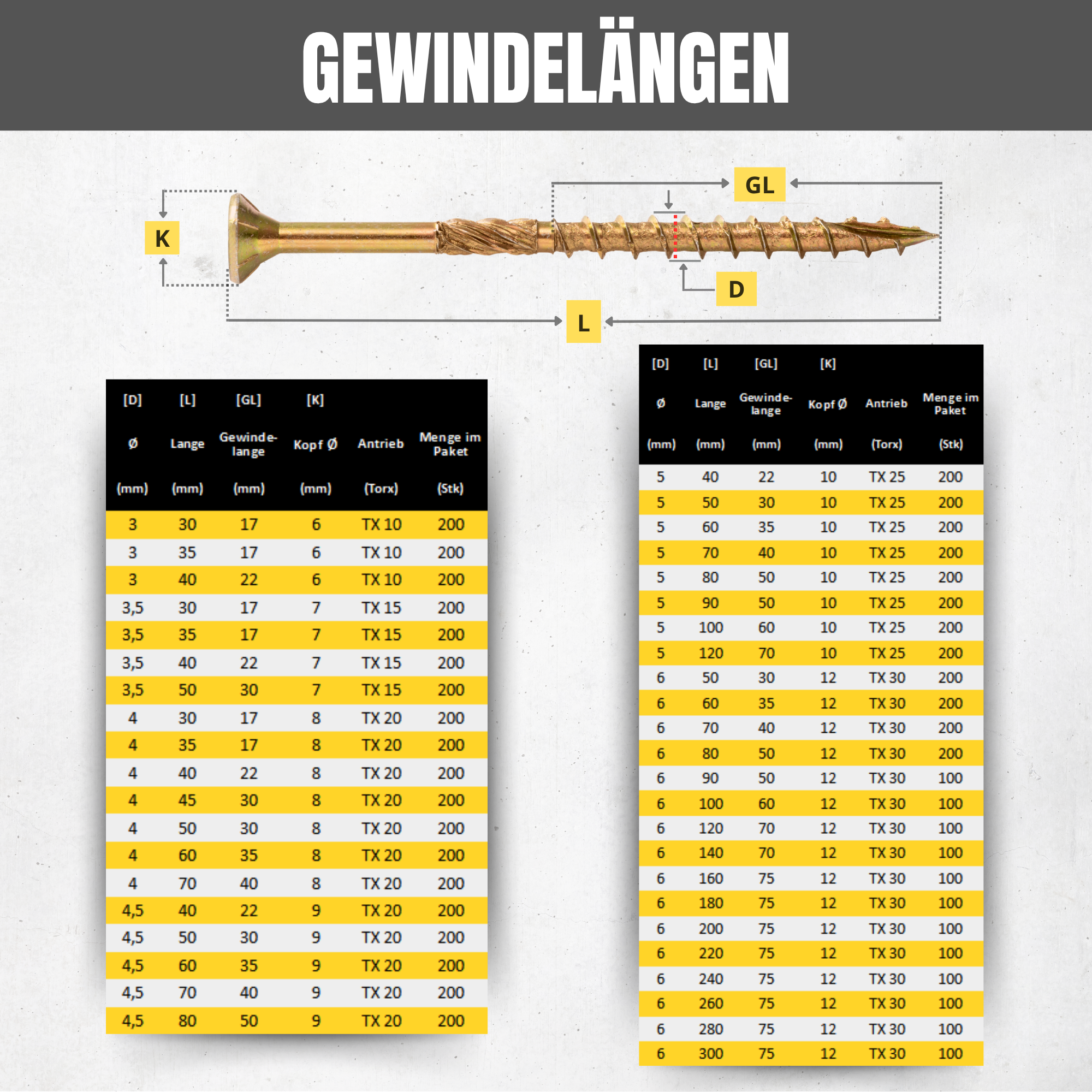 STRÜBER Holzschrauben 4,0x45 mm / 200 Stk. - Spanplattenschrauben mit Senkkopf und Torx-Antrieb - Gelb verzinkte Universalschrauben