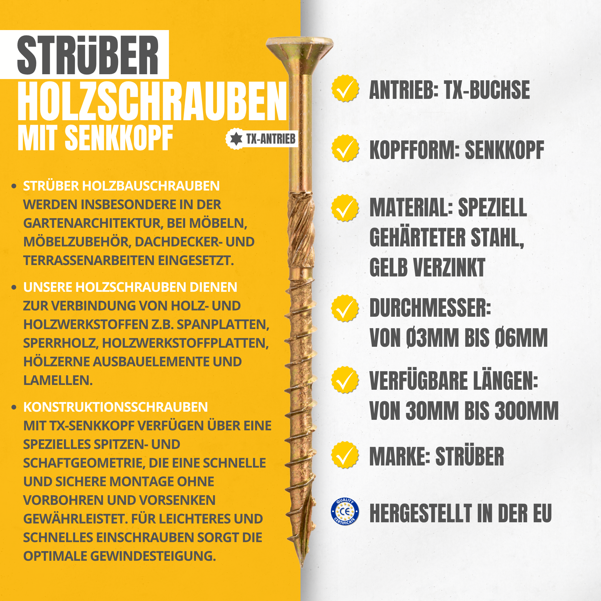 STRÜBER Holzschrauben 6,0x50 mm / 200 Stk. - Spanplattenschrauben mit Senkkopf und Torx-Antrieb - Gelb verzinkte Universalschrauben