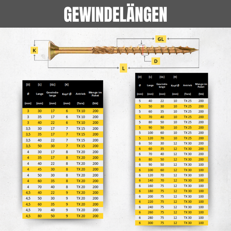 STRÜBER Holzschrauben 6,0x90 mm / 200 Stk. - Spanplattenschrauben mit Senkkopf und Torx-Antrieb - Gelb verzinkte Universalschrauben