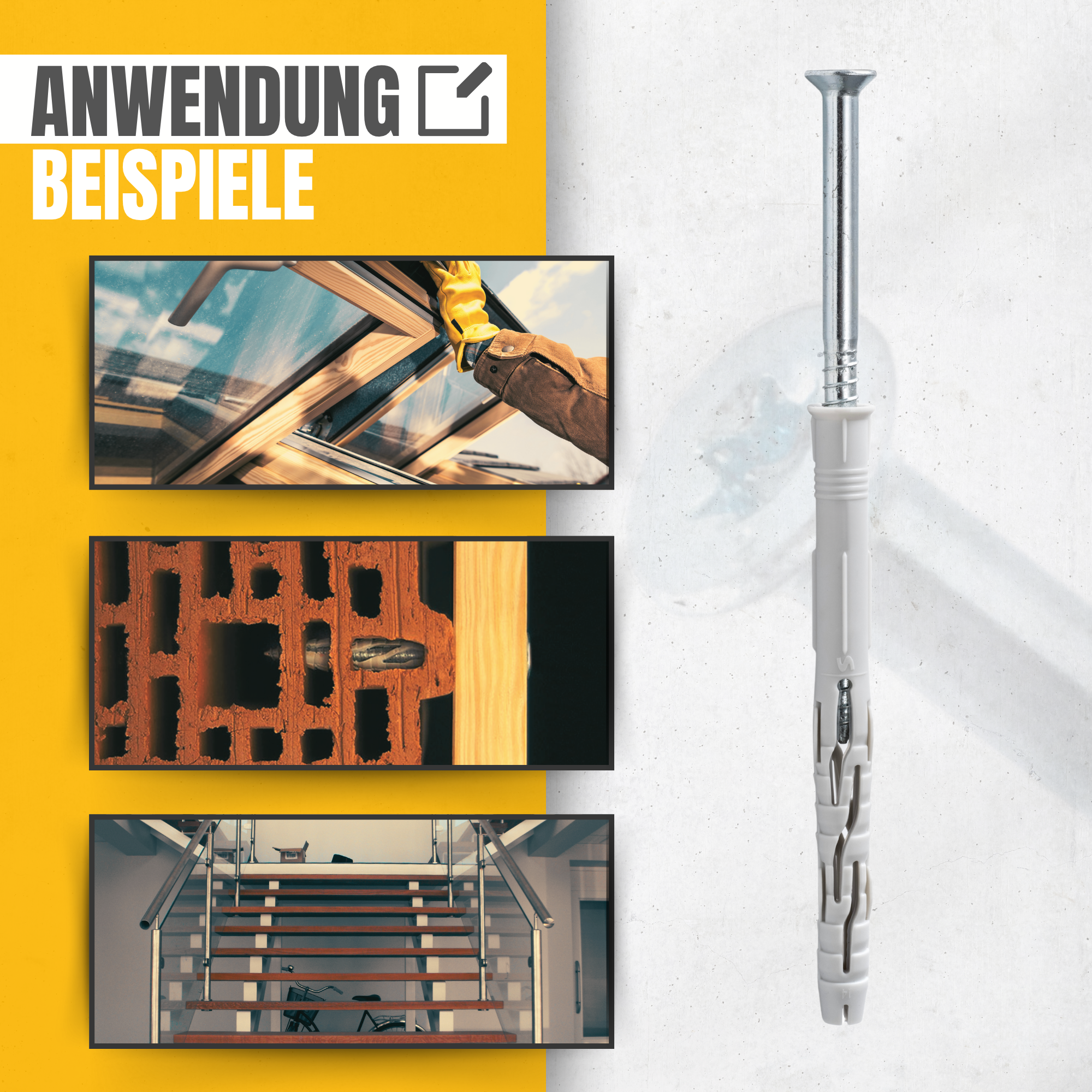 Die STRÜBER Rahmendübel sind aus hochwertigem Nylon gefertigt und durch geeignete Korrosionsschutzmittel geschützt. Sie eignen sich zur Verankerung in allen gängigen Baustoffen, darunter Voll- und Hohlsteinmauerwerk, Beton, Leichtbeton, Porenbeton, Hochlochziegel, Hohlkammerstein und Gasbeton. Die Dübel sind ideal zur Befestigung von Holzlatten, Montageschienen an Fassaden, Fensterrahmen und Metallprofilen, wo Zuverlässigkeit und hohe Haltewerte gefordert werden.