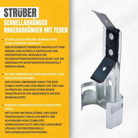 Der STRÜBER Schnellabhänger mit Feder ist ein hochwertiges Tragelement zur Verbindung von Draht mit Öse und CD-Deckenprofilen. Er dient zur Aufhängung der Tragkonstruktion von abgehängten Decken und verbindet das Hauptprofil mit einer Befestigungsstange. Dank der integrierten Feder ist eine stufenlose Einstellung der Abhängehöhe möglich, sodass die Decke exakt auf die geplante Installation angepasst werden kann.