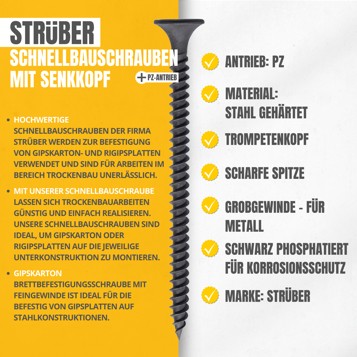 Suchbegriffe: Schnellbauschrauben, Rigips Schrauben, Gipskartonschrauben, Trockenbauschrauben, PH2 Schrauben, Senkkopfschrauben, STRÜBER Befestigung.