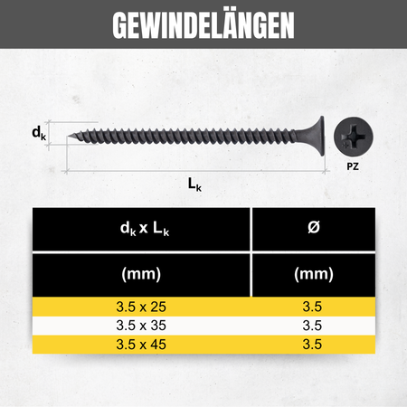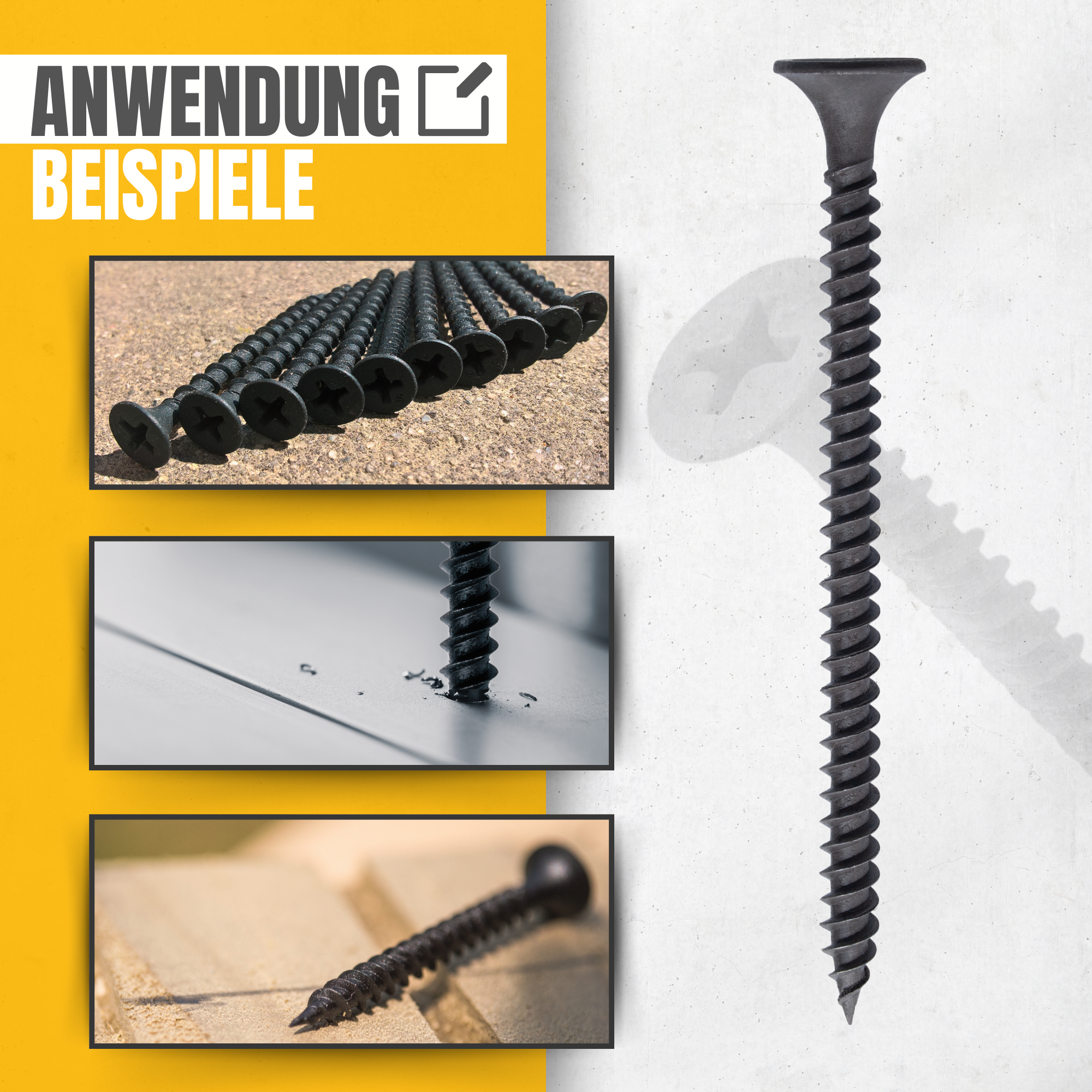 Besonders die Gipskarton-Brettbefestigungsschraube mit Feingewinde ist ideal für die sichere Befestigung von Gipsplatten auf Stahlkonstruktionen. Für Holzunterkonstruktionen stehen Schrauben mit Grobgewinde zur Verfügung.