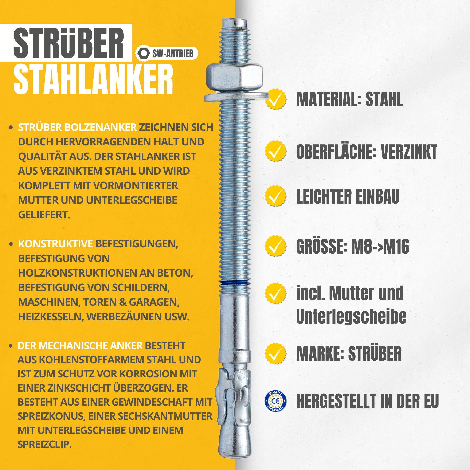 STRÜBER Bolzenanker überzeugen durch hervorragenden Halt, einfache Montage und hohe Qualität. Der Stahlanker wird aus verzinktem Stahl gefertigt und inklusive vormontierter Mutter und Unterlegscheibe geliefert. Erhältlich in verschiedenen Größen von M8 bis M16, eignet sich der Schwerlastanker ideal für Befestigungen in festen Baustoffen, Stein und ungerissenem Beton.