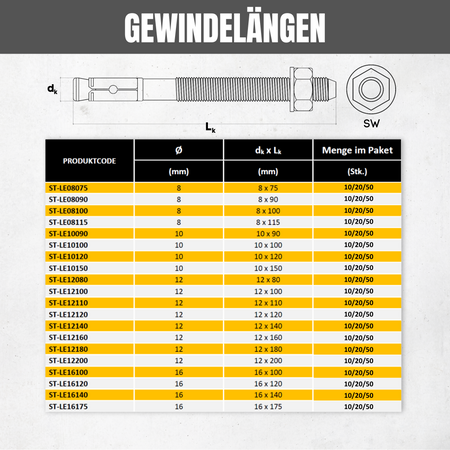 - Größe: M8 – M16 (inkl. Mutter + Unterlegscheibe)