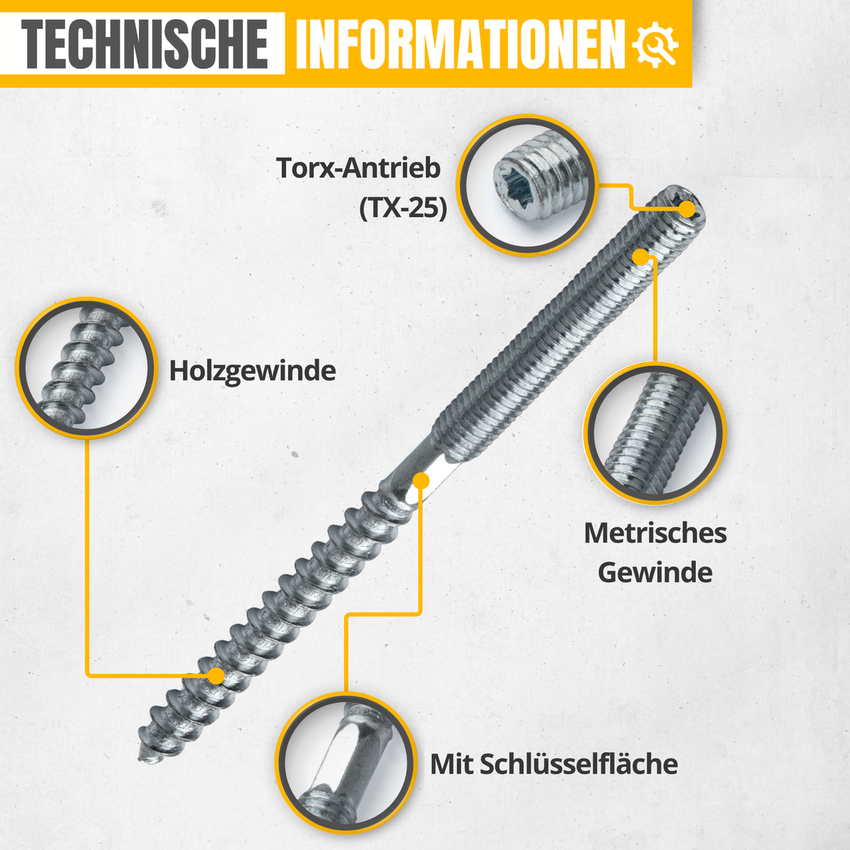- Kombination aus Holz- und Metallgewinde – vielseitig einsetzbar