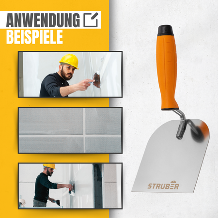 Die STRÜBER Stukkateurkelle eignet sich ideal für Verputzarbeiten, Trockenbau, Mauerarbeiten, Fliesenarbeiten sowie für Renovierungs- und Dekorationsaufgaben. Sie ist ein robustes und zuverlässiges Werkzeug, das in keiner Werkzeugausstattung fehlen darf.