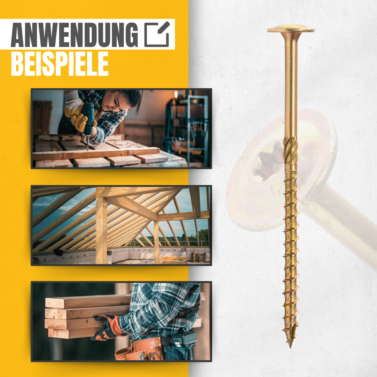 Diese Konstruktionsschrauben mit TX-Scheibenkopf ersetzen herkömmliche Nägel vollständig und gewährleisten eine starke, spannungsfreie Verbindung von Holz- und Holzwerkstoffen – z. B. Spanplatten, Sperrholz, OSB-Platten, Lamellen oder Holzelemente.