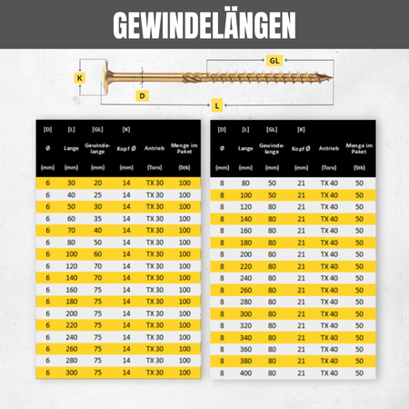 Diese Konstruktionsschrauben mit TX-Scheibenkopf ersetzen herkömmliche Nägel vollständig und gewährleisten eine starke, spannungsfreie Verbindung von Holz- und Holzwerkstoffen – z. B. Spanplatten, Sperrholz, OSB-Platten, Lamellen oder Holzelemente.