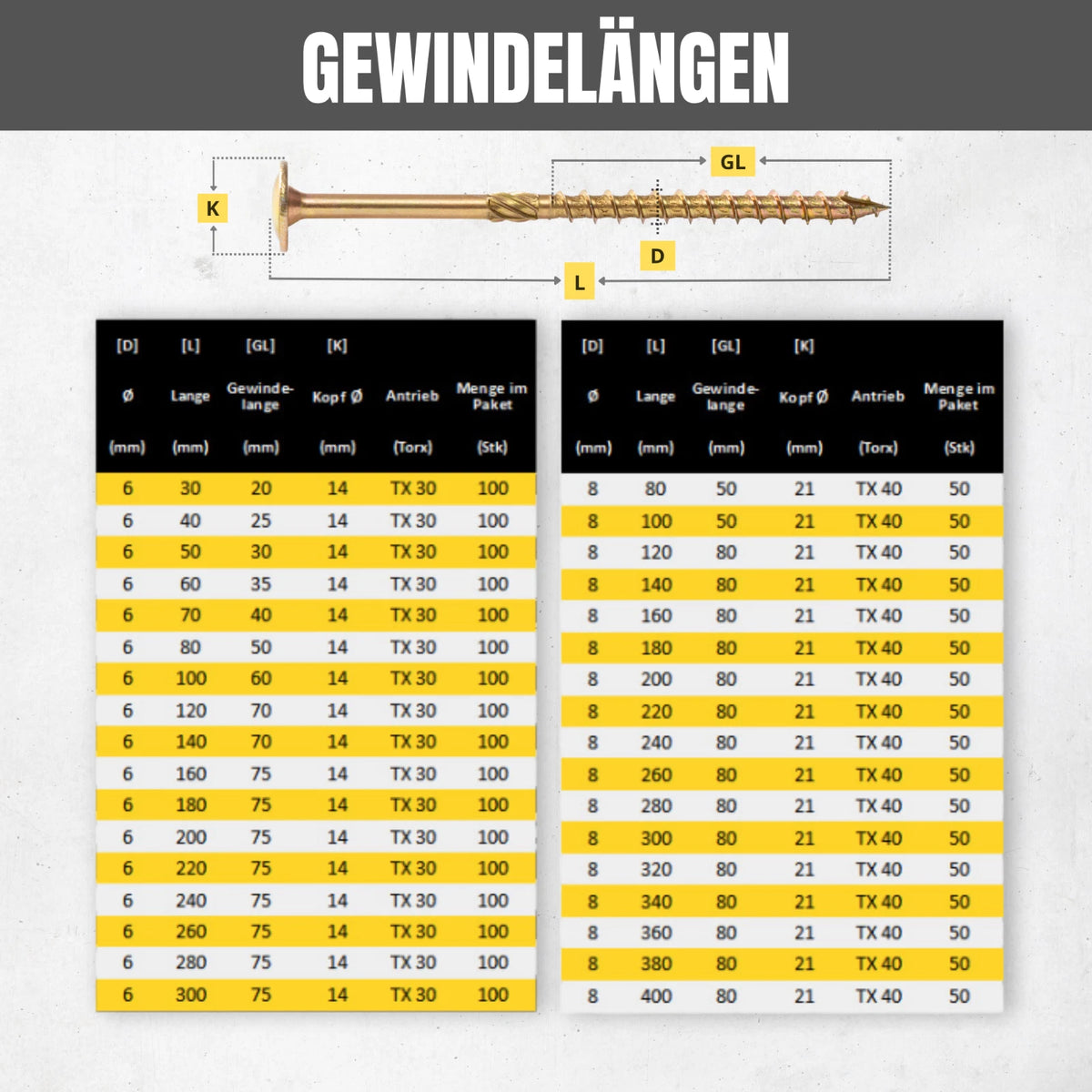 Diese Konstruktionsschrauben mit TX-Scheibenkopf ersetzen herkömmliche Nägel vollständig und gewährleisten eine starke, spannungsfreie Verbindung von Holz- und Holzwerkstoffen – z. B. Spanplatten, Sperrholz, OSB-Platten, Lamellen oder Holzelemente.