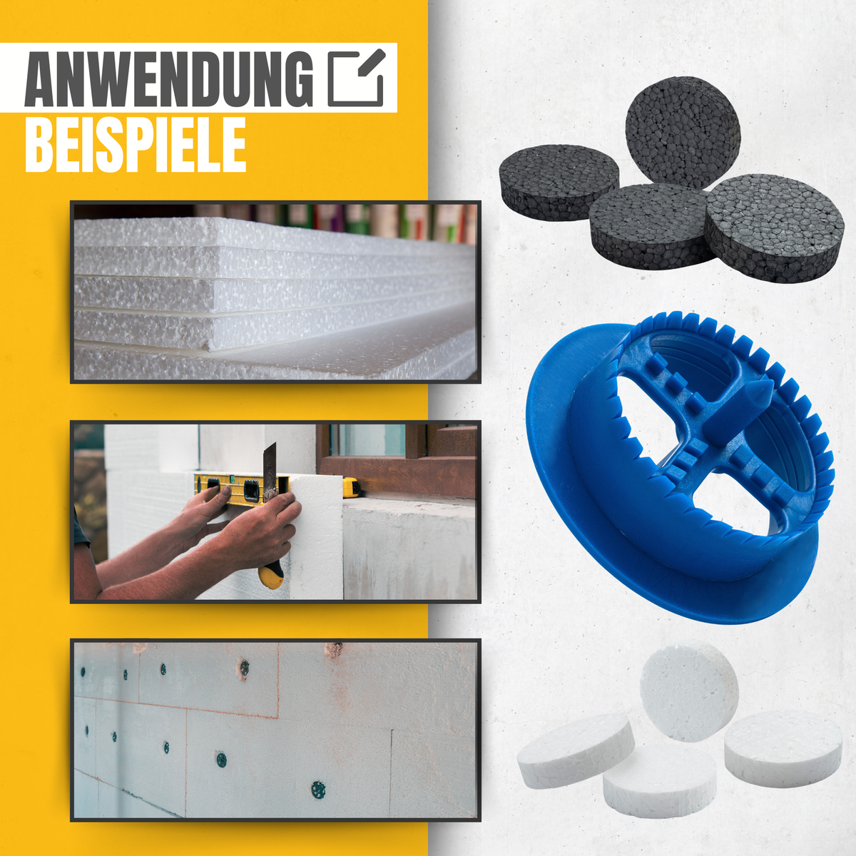 Die im Set enthaltenen Styropor-Rondellen werden zum Verschließen der ausgefrästen Löcher und zum Abdecken der Dübelköpfe verwendet. Sie verhindern Wärmebrücken, verbessern die Energieeffizienz und erleichtern den Abschluss bei Putzarbeiten. Dank ihrer standardisierten Maße können 2 cm kürzere Dübel verwendet werden – was sowohl Material als auch Zeit spart.